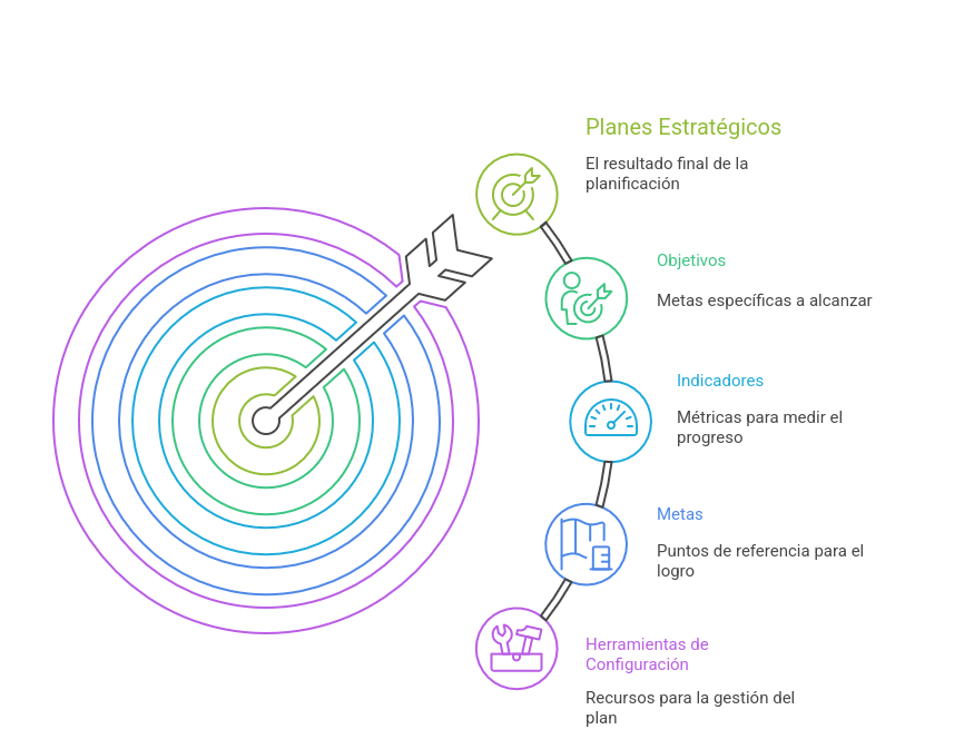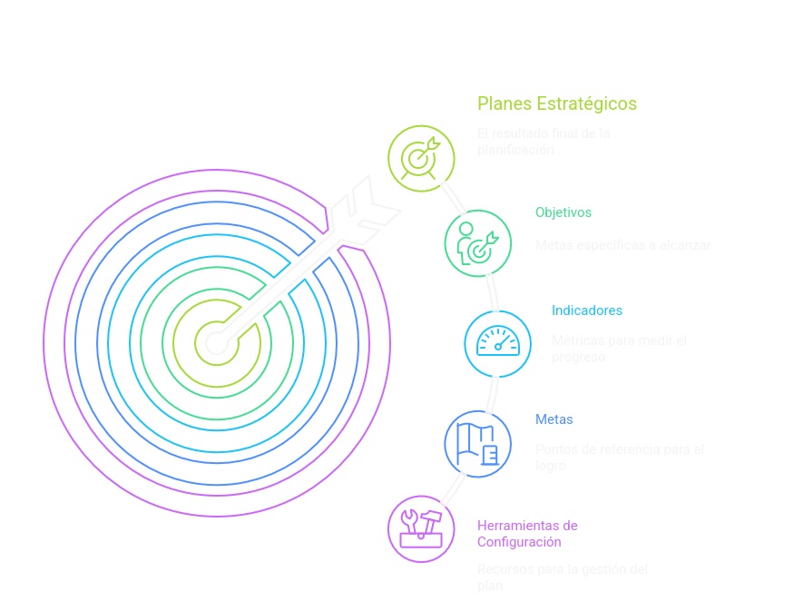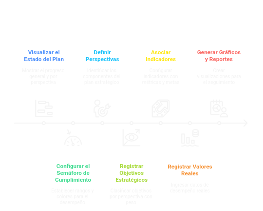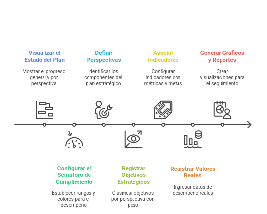 A través de este módulo se pueden estructurar planes estratégicos completos, vinculando objetivos, indicadores y metas, organizados por perspectivas y periodos. Adicionalmente, se ofrece una visualización gráfica del cumplimiento, herramientas de configuración y espacios para registrar avances reales.