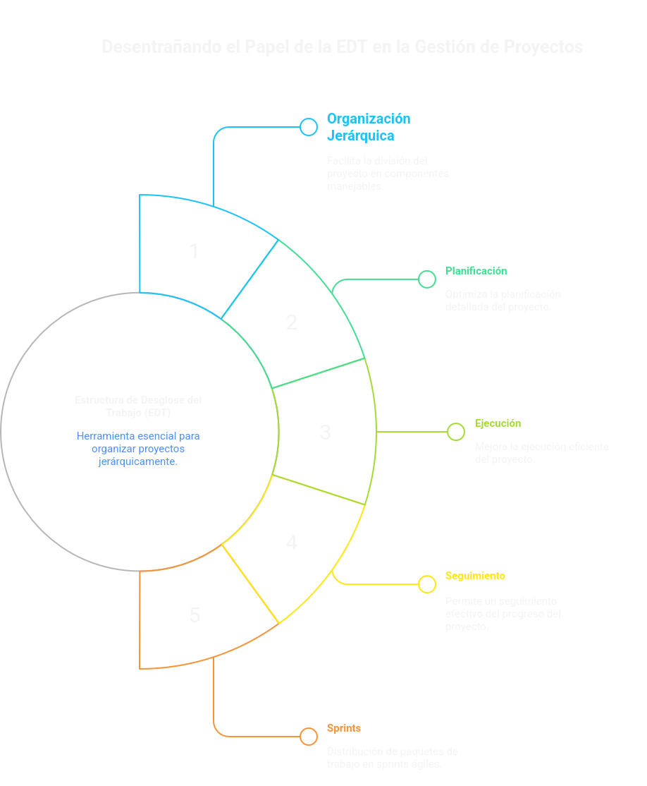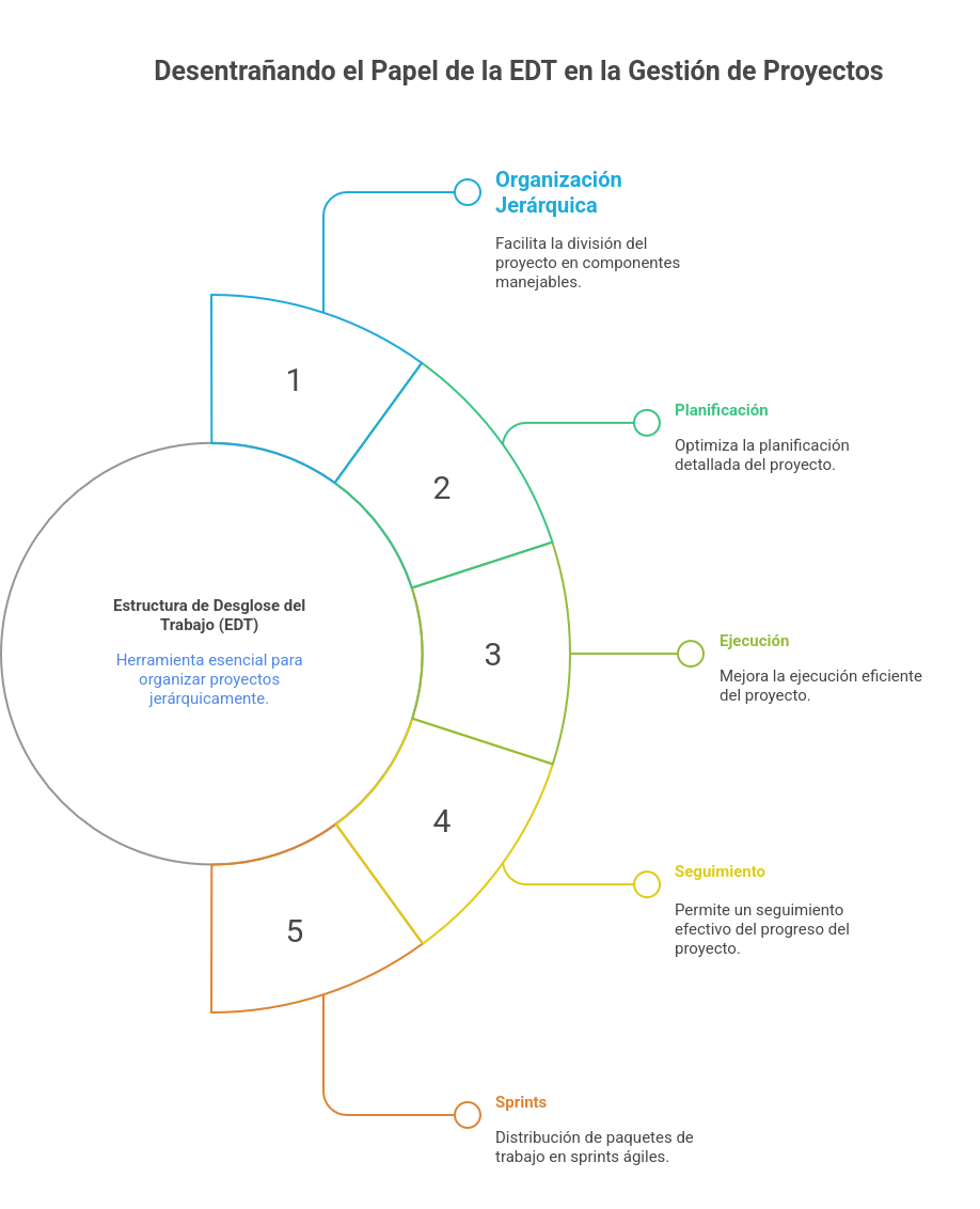 La Estructura de Desglose del Trabajo (EDT) permite organizar un proyecto en componentes jerárquicos que facilitan su planificación, ejecución y seguimiento. A través del EDT se definen productos y paquetes de trabajo.