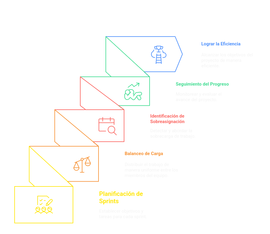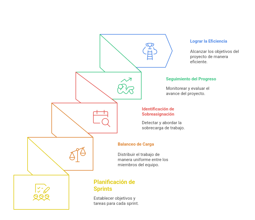 La planificación ágil permite organizar la ejecución del proyecto mediante la distribución de paquetes de trabajo en sprints. Esta vista facilita el balanceo de carga (revisión de sobreasignación) y el seguimiento del avance por sprints.