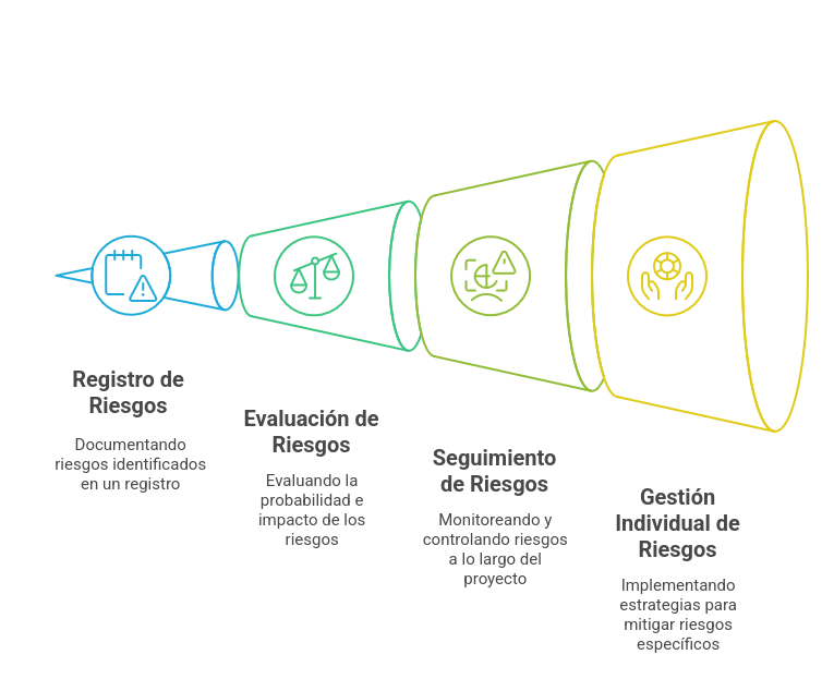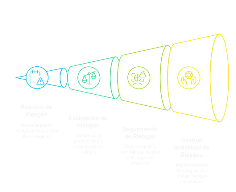 La gestión de riesgos permite identificar, registrar, evaluar y dar seguimiento a los riesgos que pueden afectar el cumplimiento del proyecto. Cada riesgo se asocia a un paquete de trabajo y se gestiona de forma individual.